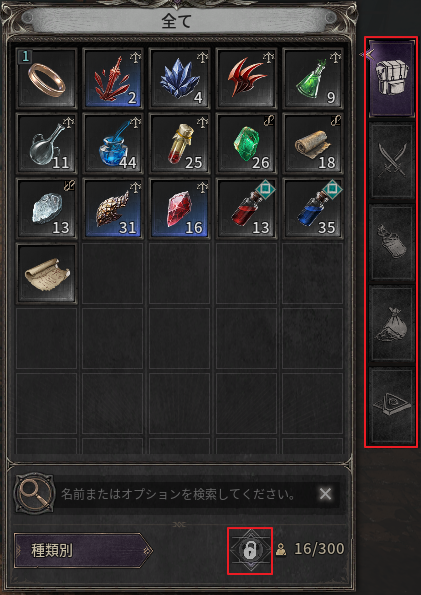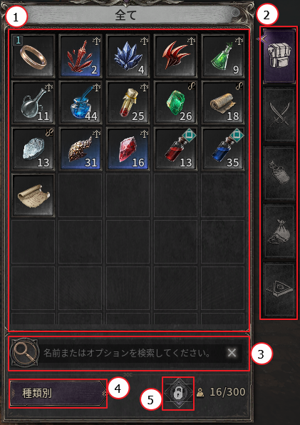 - 一般インベントリー:タリスマンを除くアイテムを保管でき、所持上限は最大300個までです。