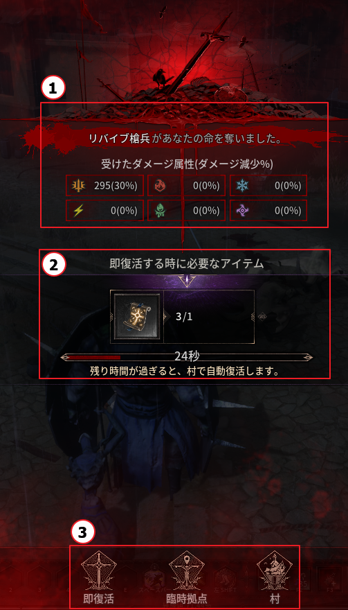 モンスターの攻撃または状態異常ダメージにより死亡すると、復活画面が表示されます。