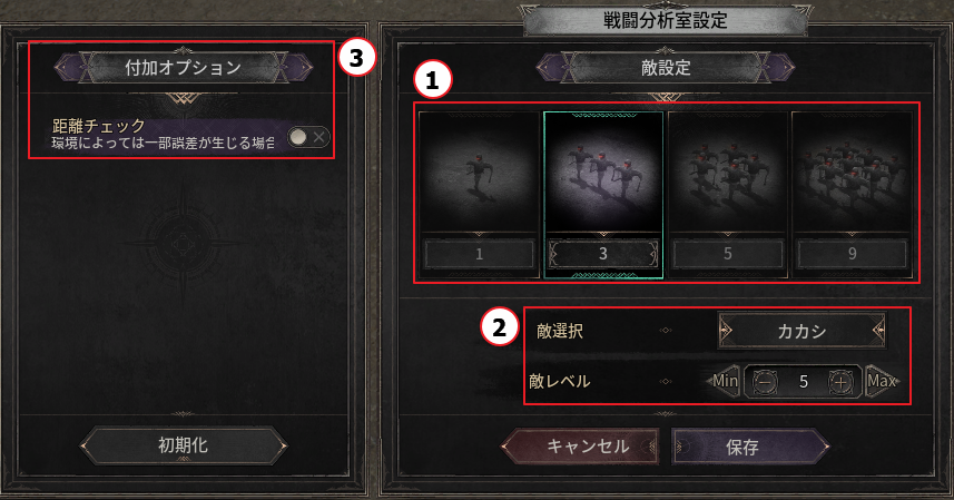 ③ ダメージ測定時に適用できる追加オプションを選択できます。