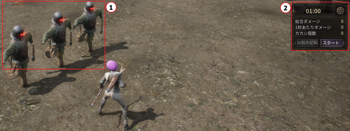 ① ダメージ測定に使用するトレーニングダミーを確認できます。