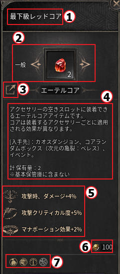 ① エーテルコアの名称を確認できます。