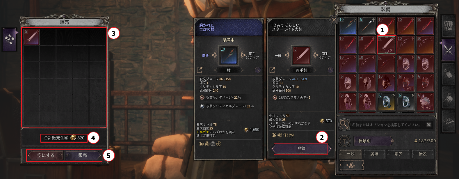 「売却」をクリックすると③のリスト内のアイテムがすべて売却されます。