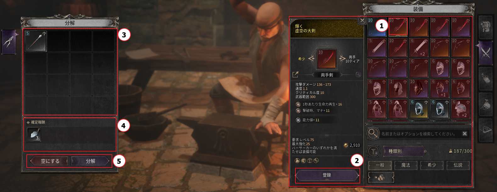 - アイテム分解は、町にいる鍛冶屋NPCから行うことができます。