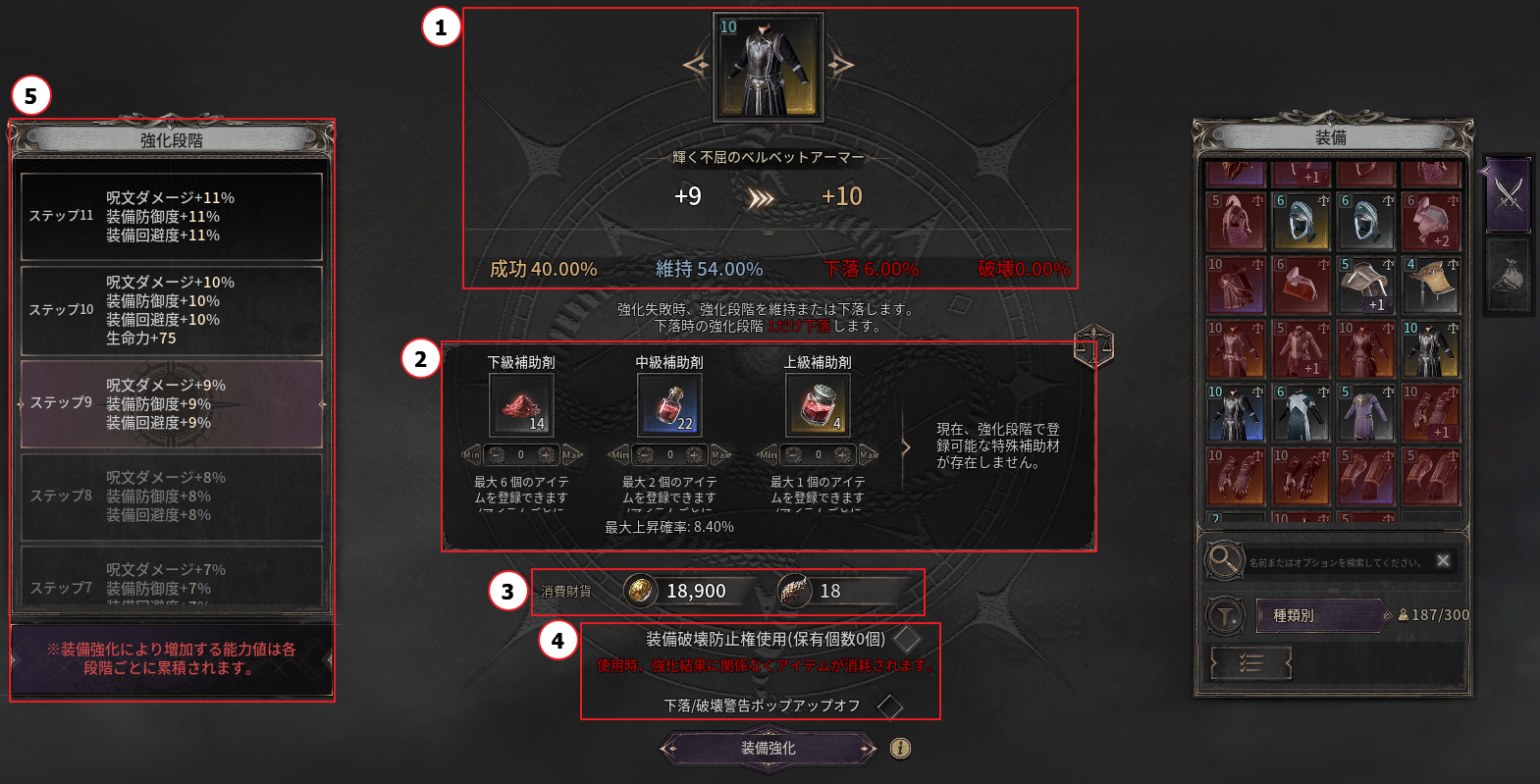 ② 強化レベル10以上からは、3種類の追加素材アイテムを使用して、成功確率を高めることができます。
