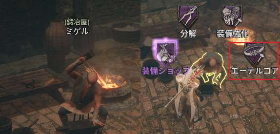 - エーテルコアの装着は、町にいる鍛冶屋NPCから行うことができます。