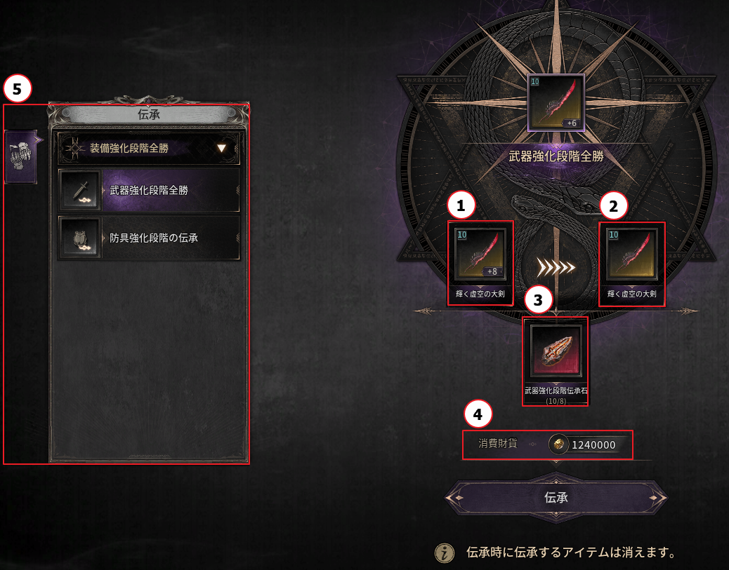 - 伝承は、アイテムの能力値および強化段階を、別のアイテムへ移すことができるシステムです。