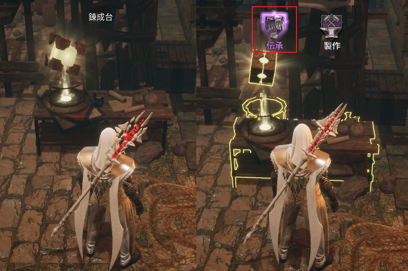 - 伝承は、町にある錬成台オブジェクトから行うことができます。
