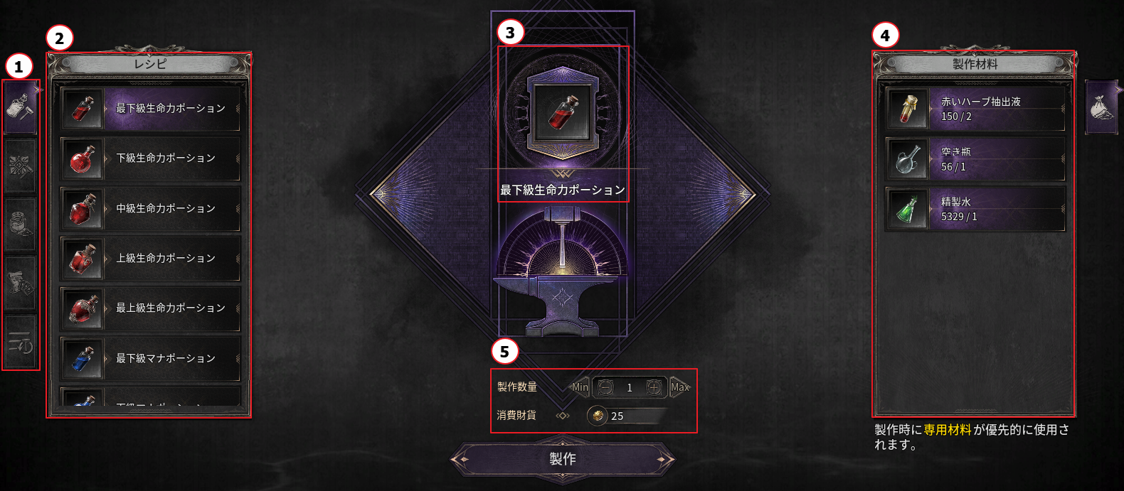 決められたレシピをもとにポーション、結晶、入場券などを製作するレシピ製作の2種類に分かれています。