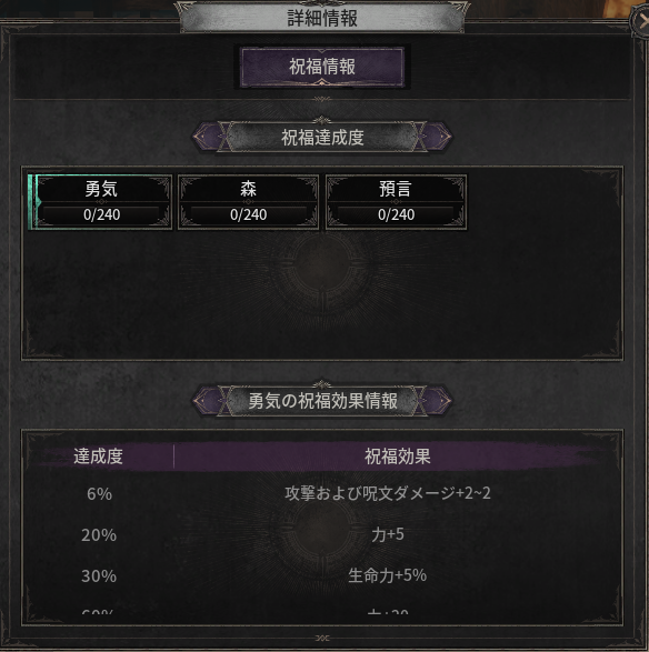 - 各タリスマンの祝福数値を合算すると**「達成度」が上昇し、達成度に応じて段階別の祝福効果**を獲得できます。