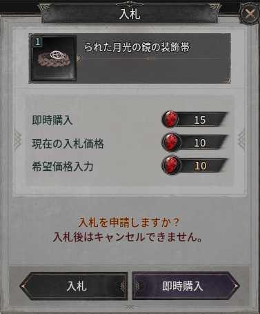 - 購入タブで検索後、希望するアイテムを選択すると、即時購入または入札のいずれかを選択できます。