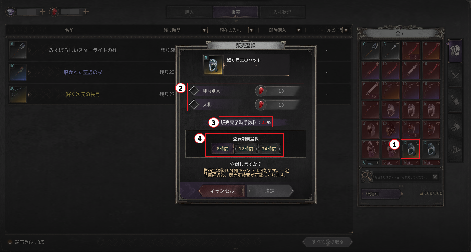 ④ アイテムを競売所に販売登録する掲載期間を設定できます。