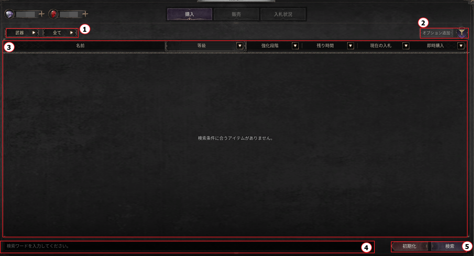 - 競売所は、購入/出品/入札状況の3つのタブに分かれています。