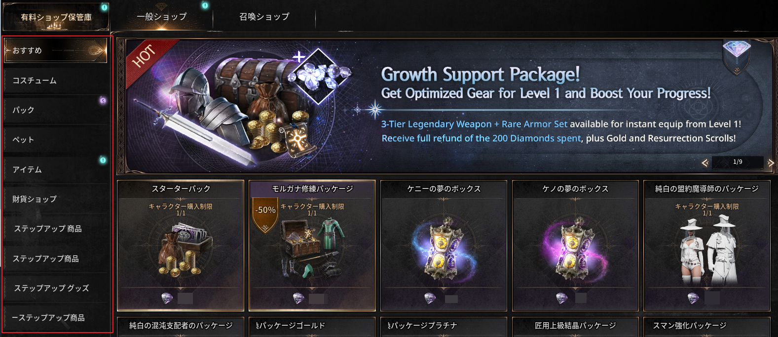 - 有料ショップは、一般ショップ/召喚ショップ/有料ショップ保管庫の3つに分かれています。
