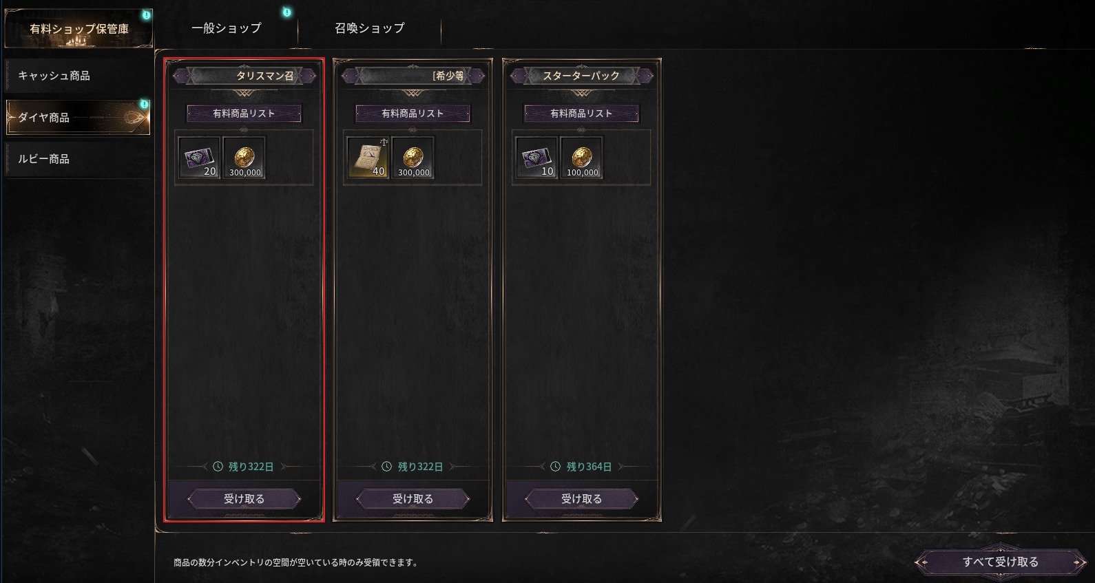 - 有料ショップ保管庫にて、**決済タイプ(キャッシュ/ダイヤ/ルビー)に応じた商品タブを選択し、購入した商品の下にある「受け取る」**をクリックすると、