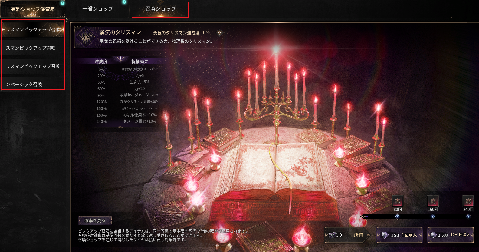 - 召喚ショップでは、召喚を通じてタリスマンを獲得できます。