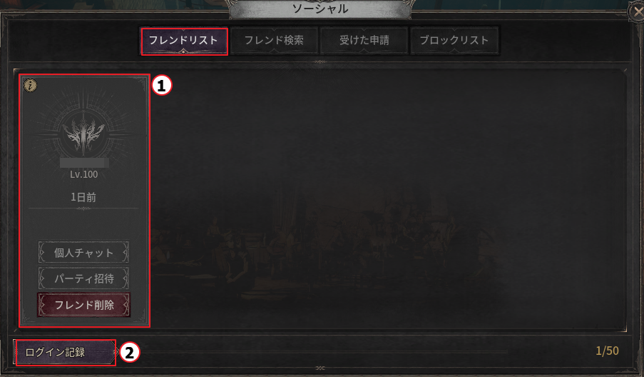 ① 登録されているフレンドのオンライン状況や基本情報を確認できます。