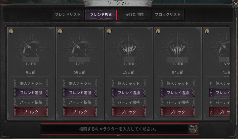 - フレンド検索タブでは、下部の検索欄にプレイヤー名を入力して検索し、