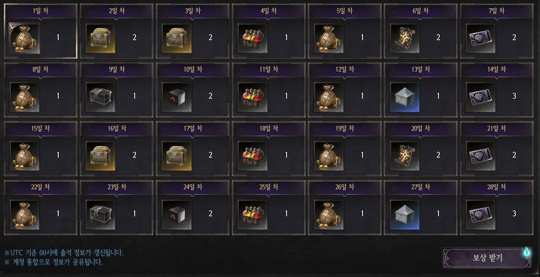 22일 차 | [전용] 골드 주머니 | 1 | 사용 시 1~5만 골드 사이에서 랜덤하게 획득할 수 있습니다. |