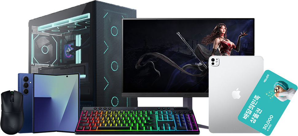 ✨축복 받은 룬기사 (1명) | [🖥️650만원 상당 PC 구성품 세트] - 프리미엄 조립PC (9800X3D / 5080 / 64GB) 1대 - LG 울트라기어 게이밍모니터 1대 - RAZER 블랙위도우 V4 리니어 KR 키보드 1대 - RAZER 데스에더 V4 Pro 마우스 1대 |