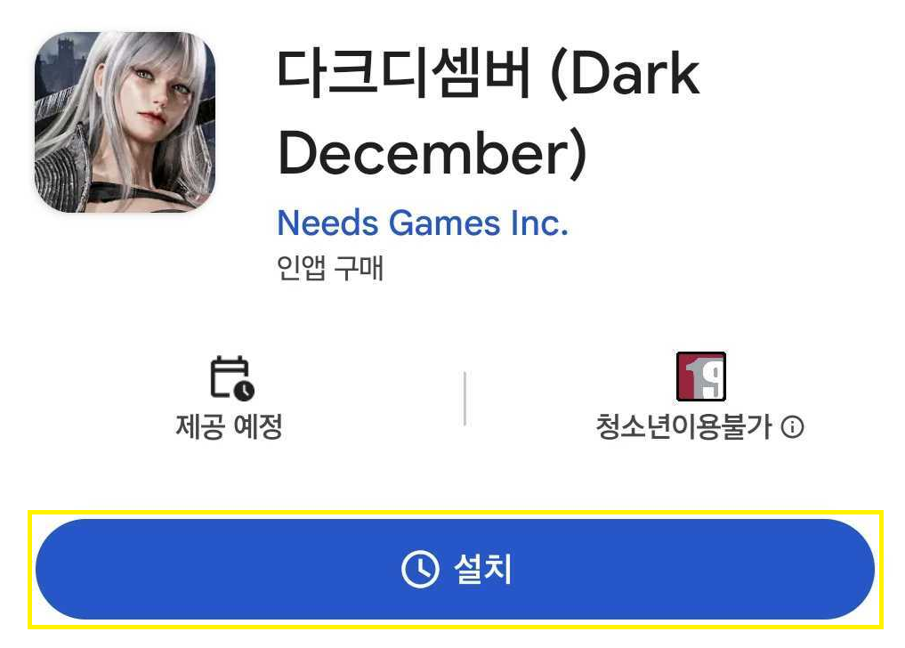 - 검색된 다크디셈버 스토어 페이지에서 설치를 클릭하여 앱 다운로드를 진행합니다.