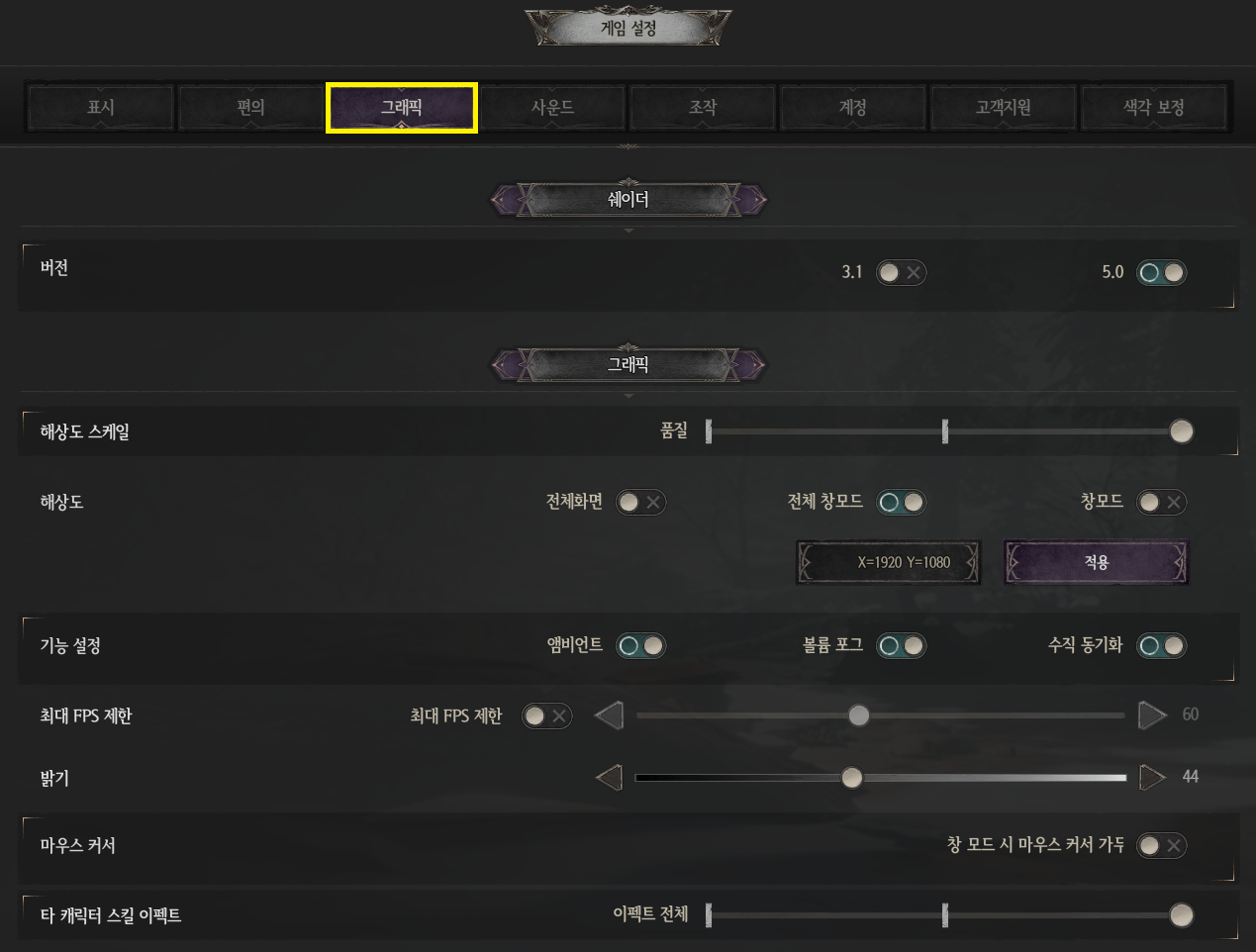 - 해상도, FPS 제한, 밝기 등 그래픽 관련 세부 설정을 조정할 수 있습니다.