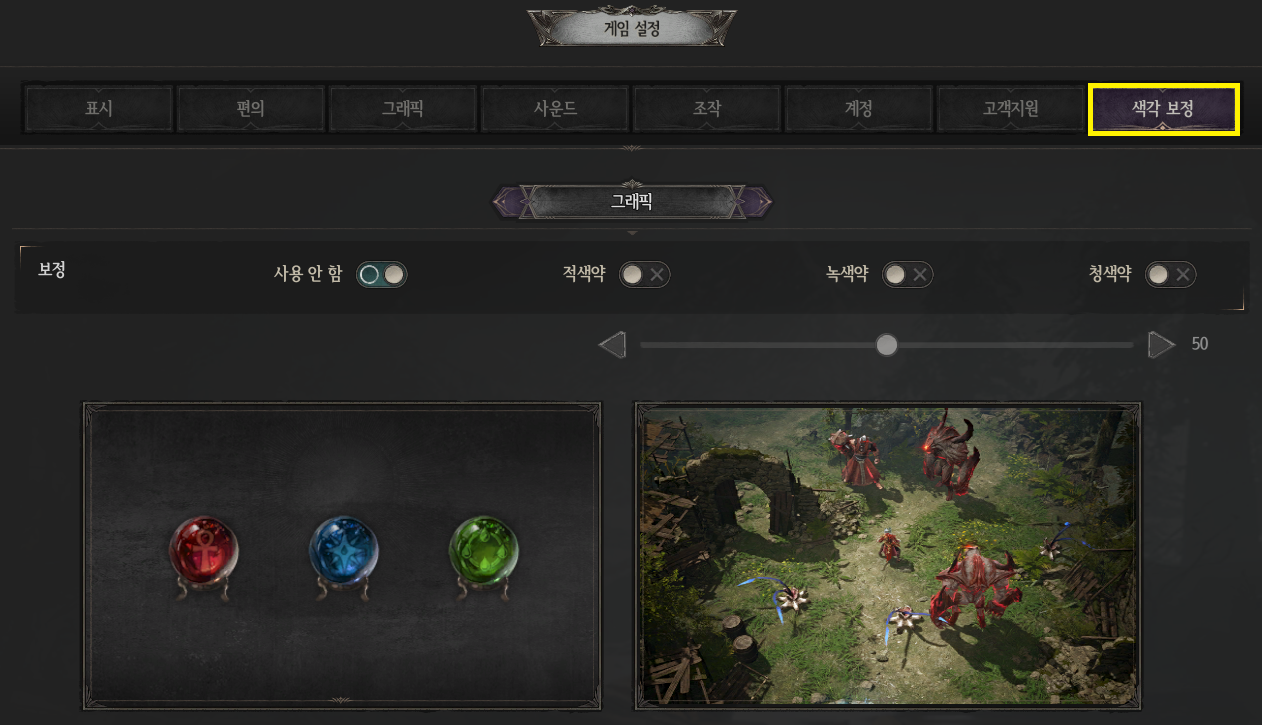 - 적색, 녹색, 청색 등의 색각 보정을 설정할 수 있습니다.