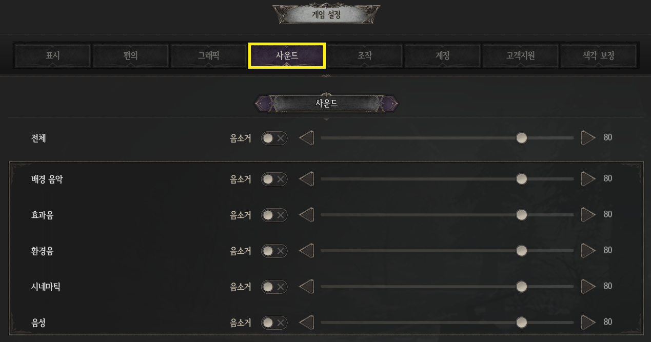 - 게임 플레이 시 전체를 비롯하여 배경 음악, 효과음 등을 조정할 수 있습니다.