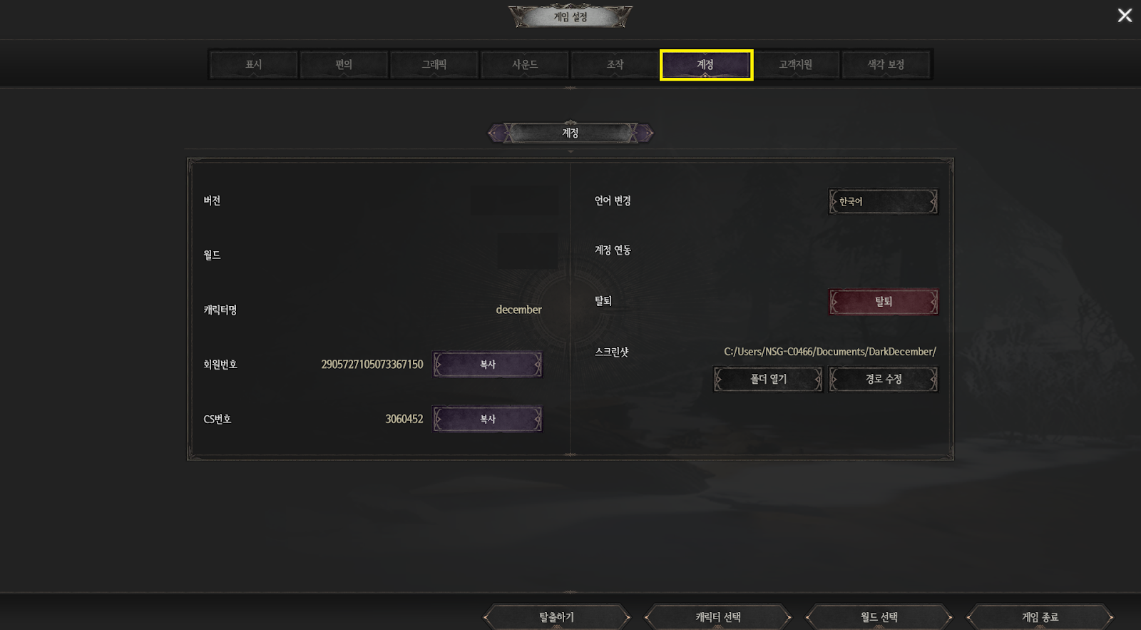 - 현재 플레이 중인 계정의 회원번호를 확인할 수 있으며, 복사 버튼을 클릭하여 1:1 문의 등에 사용할 수 있습니다.