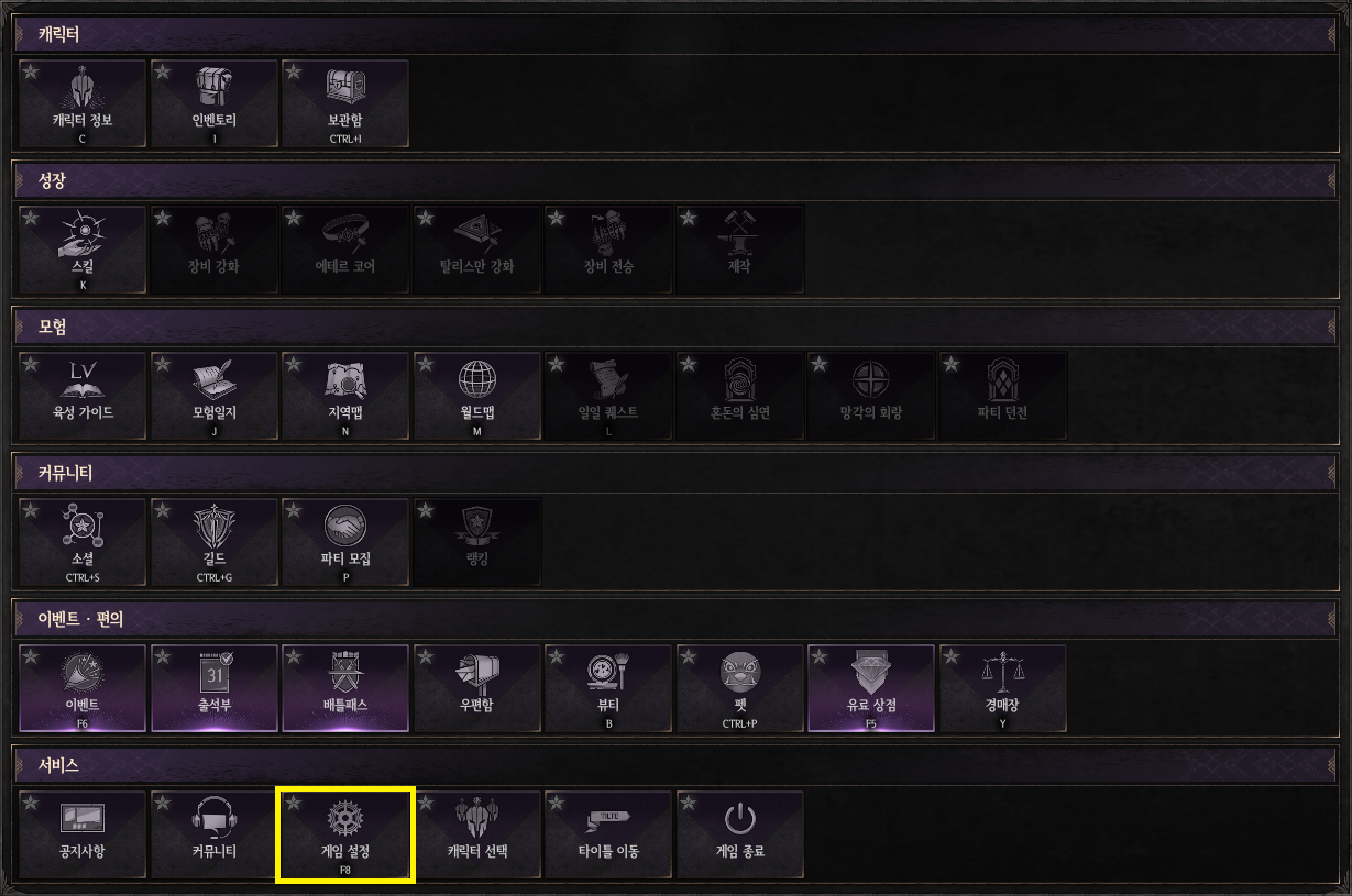 - 게임 메뉴에서 최하단 서비스 카테고리에서 게임 설정을 클릭합니다.