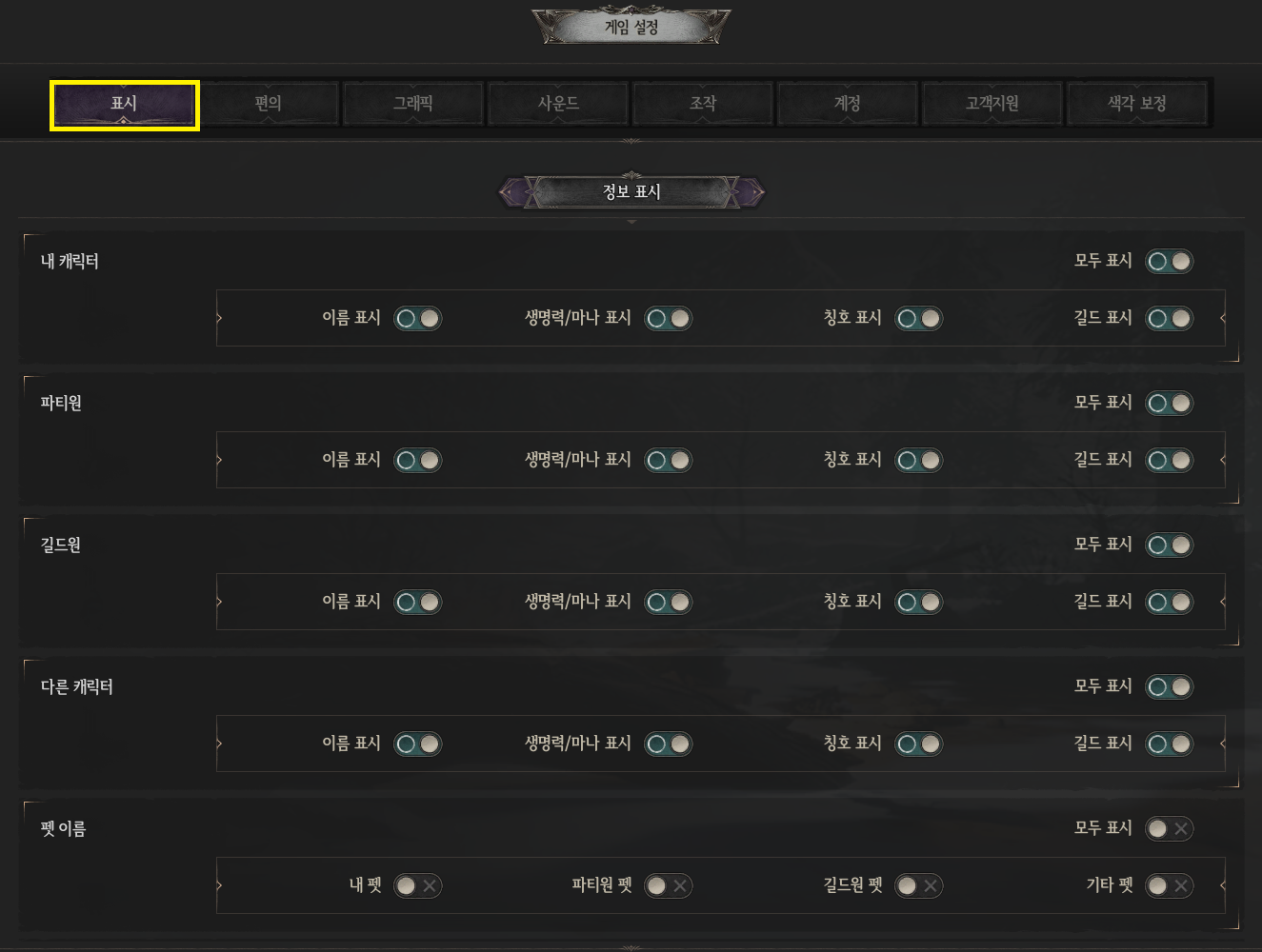 - 플레이 화면에서 표시되는 내 캐릭터, 파티원 등 각종 정보들을 세부적으로 조정할 수 있습니다.