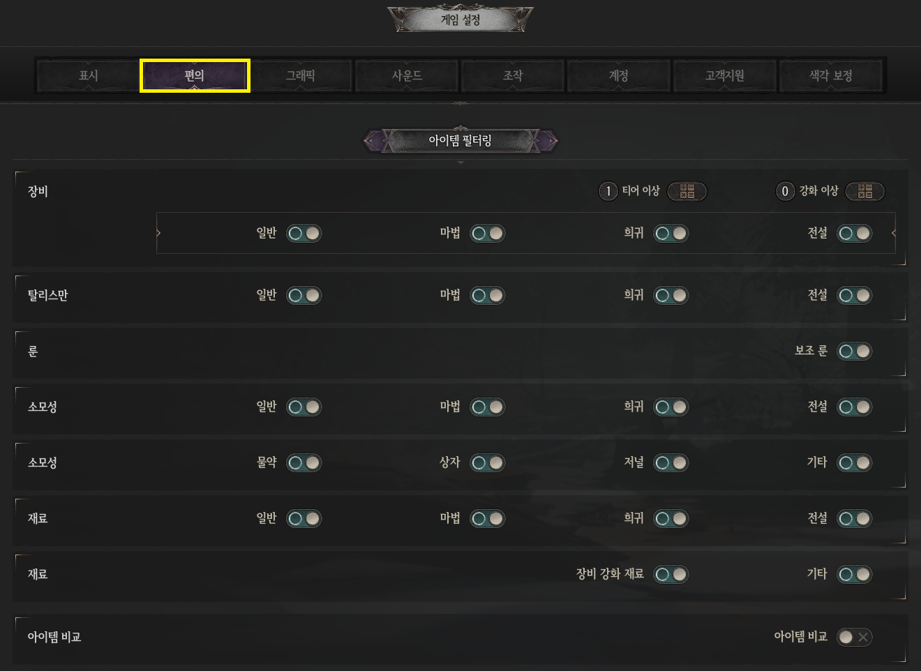 - 획득하는 아이템을 필터링을 통하여 조정할 수 있습니다.