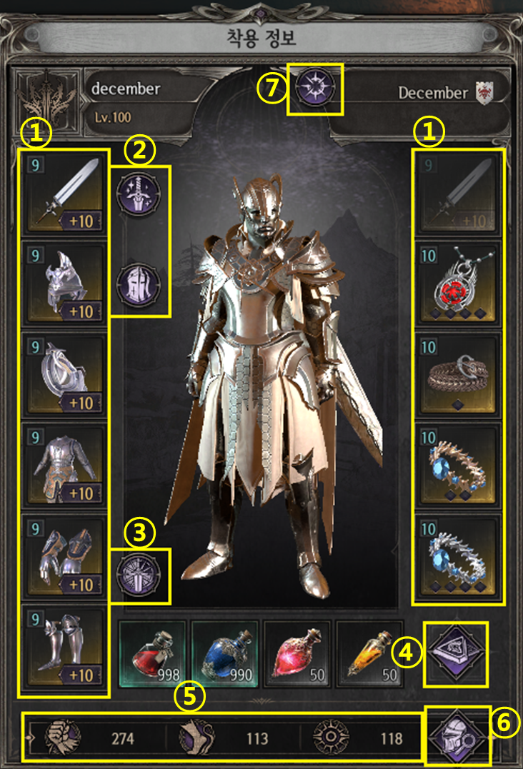 ① 현재 캐릭터가 착용 중인 장비와 장신구