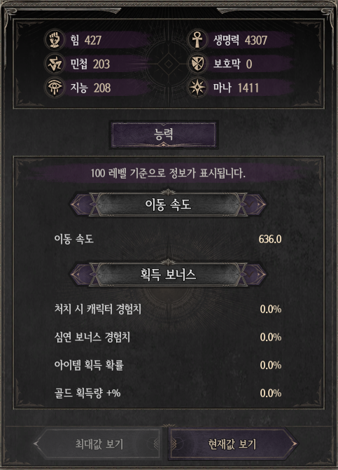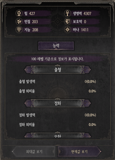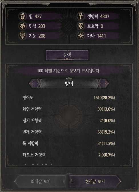 - 방어, 회피 등 캐릭터의 방어와 관련된 정보를 확인할 수 있습니다.