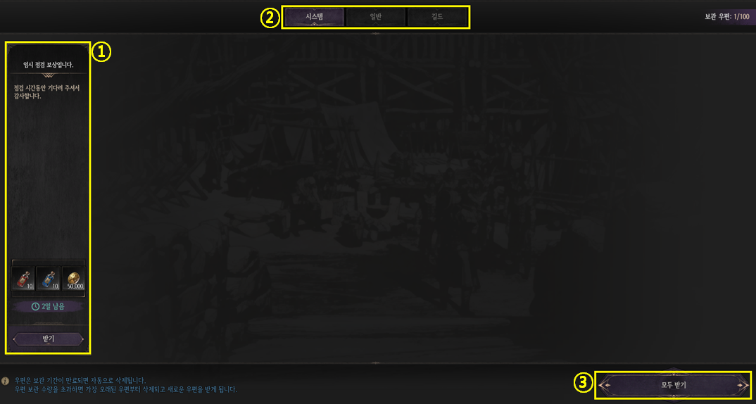 ② 우편함은 크게 시스템, 일반 및 길드로 나뉩니다.