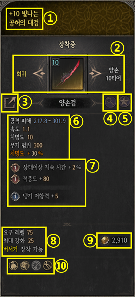 ① 아이템의 강화 단계와 아이템 이름을 확인할 수 있습니다.