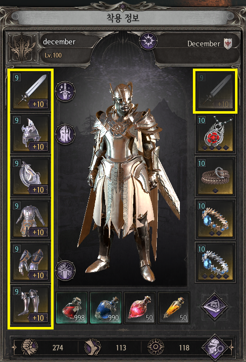 - 무기의 경우 클래스에 따라 오른쪽 보조 무기란을 사용하는 경우가 있습니다.