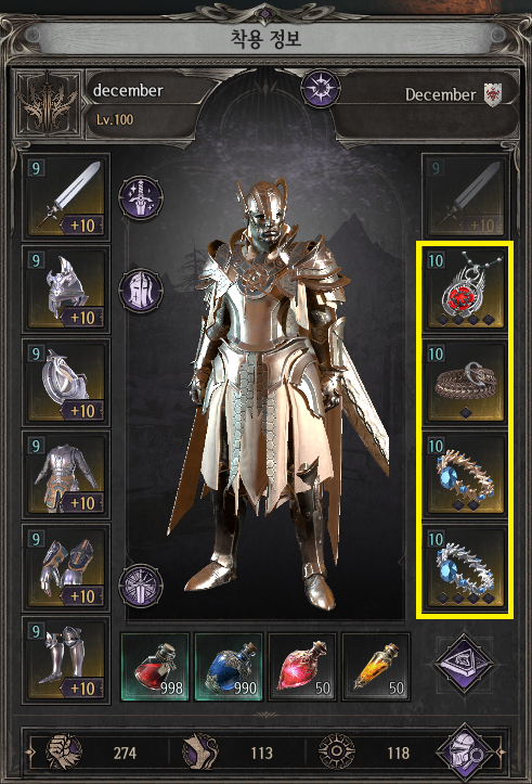 - 장신구는 캐릭터가 장착할 수 있는 총 4부위 (목걸이, 허리, 반지 2개)를 의미합니다.