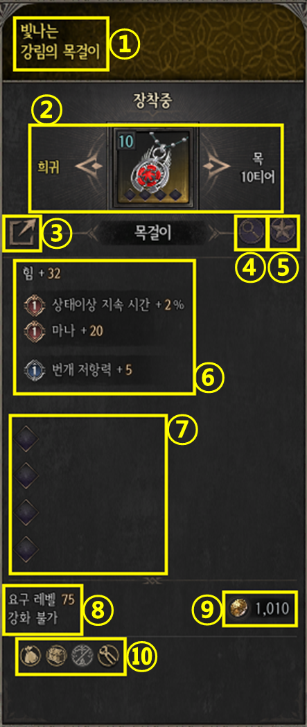 ⑥ 아이템의 기본 및 추가 능력치를 확인할 수 있으며, 동일한 아이템이라도 능력치나 스탯이 다를 수 있습니다.