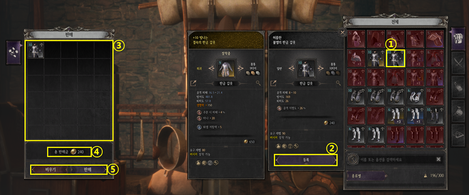 ⑤ 비우기를 클릭하면 3번 목록이 초기화되며, 판매를 클릭 시 3번 목록 내 아이템이 모두 판매됩니다.