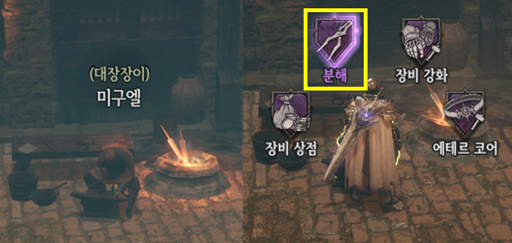 - 아이템 분해는 마을 내 대장장이 NPC한테서 진행할 수 있습니다.