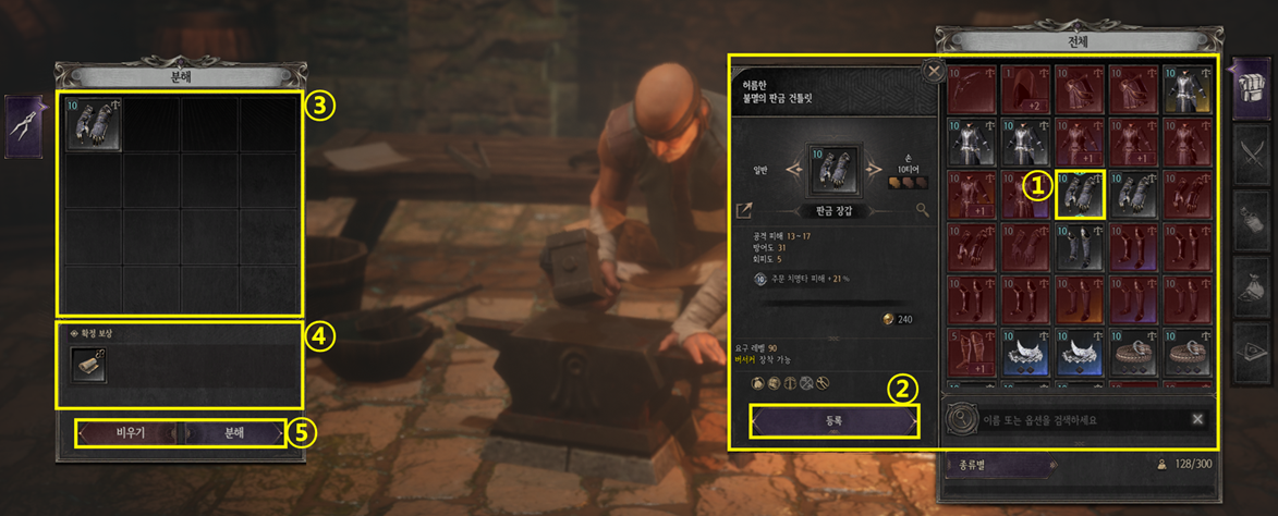 ⑤ 비우기를 클릭하면 3번 목록이 초기화되며, 분해를 클릭 시 3번 목록 내 아이템이 모두 분해됩니다.