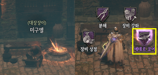 - 에테르 코어 장착은 마을 내 대장장이 NPC한테서 진행할 수 있습니다.