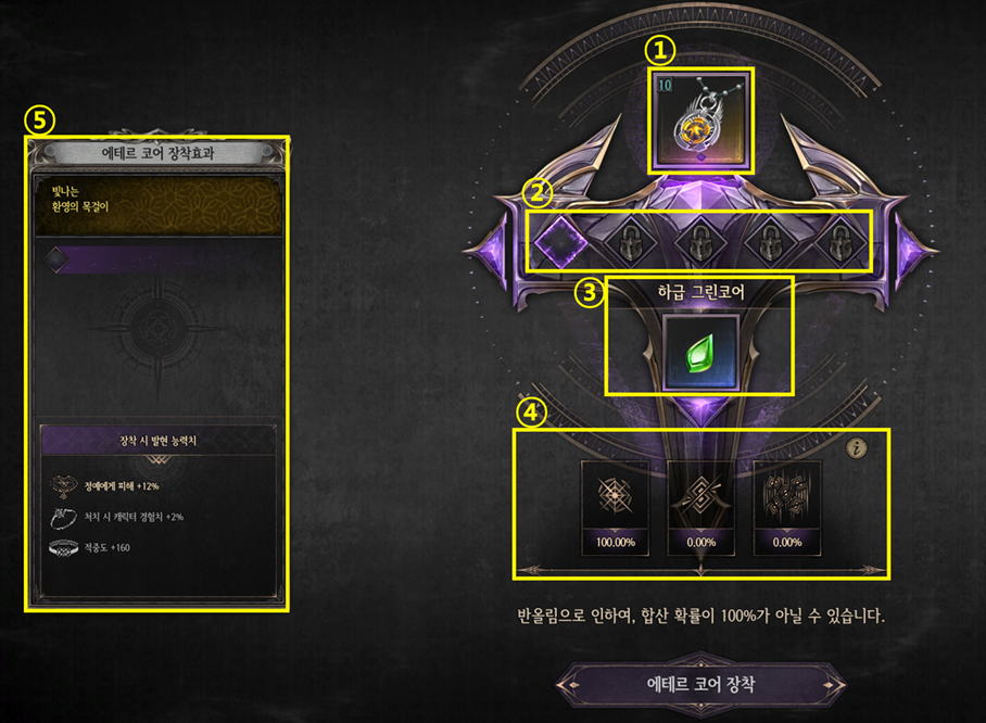 ④ 에테르 코어 장착 시 성공 및 실패 확률, 실패 시 기존 코어 파괴 확률을 함께 확인할 수 있습니다.