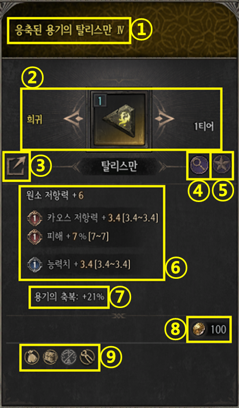 ② 탈리스만의 등급, 아이콘 및 티어를 확인할 수 있습니다.