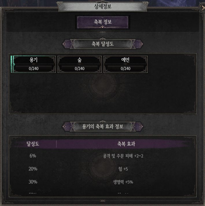- 각 탈리스만의 축복 수치를 모두 합산하면 ‘달성도’가 오르며, 달성도에 따라 정해진 단계별 축복 효과를 획득할 수 있습니다.