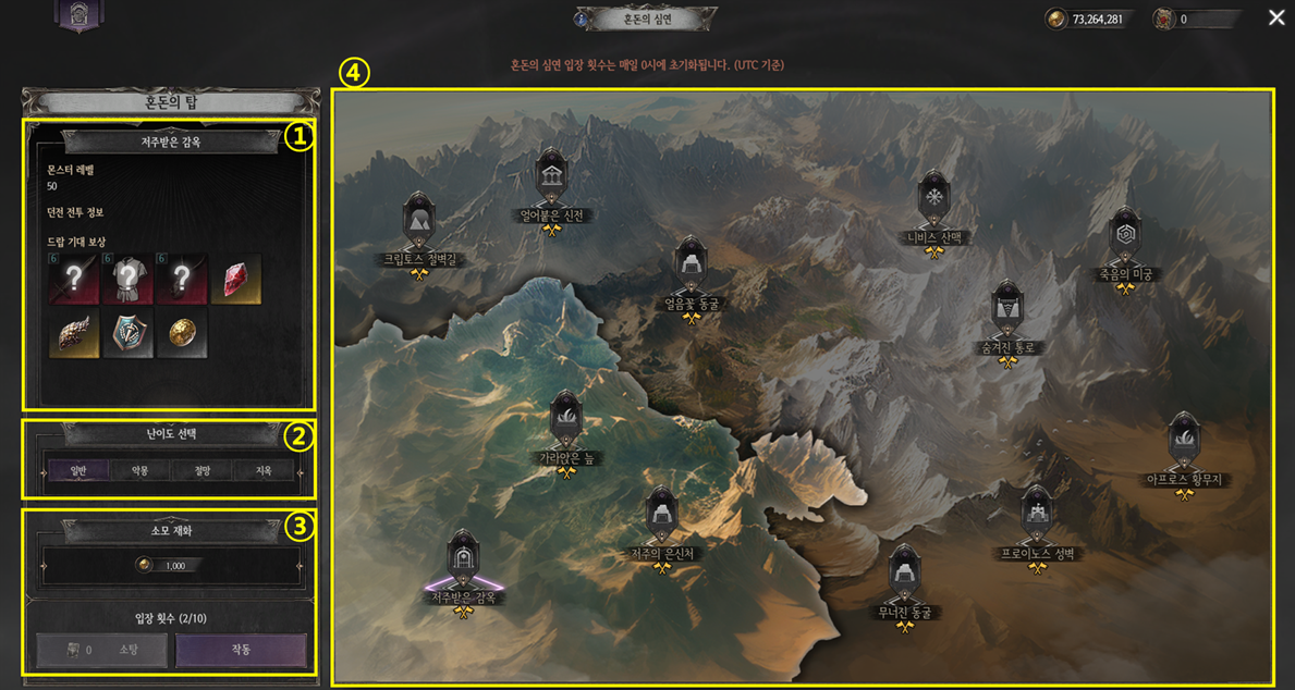 - 난이도는 총 4단계로 구성되어 있으며, 12개의 던전을 동일 난이도로 한 번씩 클리어해야 다음 난이도가 해금됩니다.