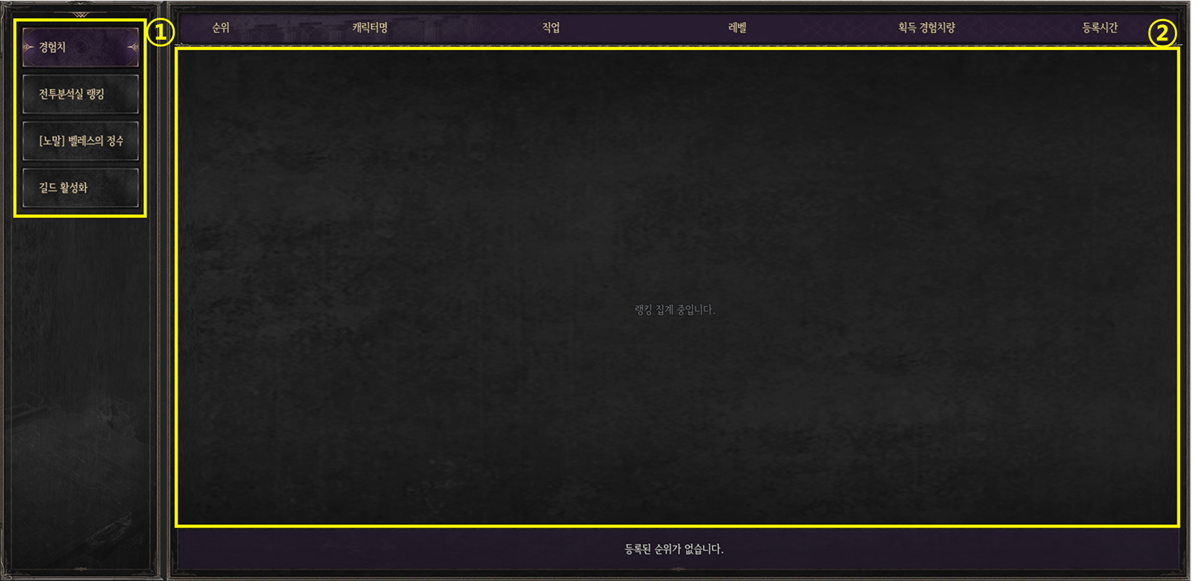 ② 각 카테고리에 따른 순위, 캐릭터명, 직업, 레벨, 획득 경험치량 및 등록시간을 확인할 수 있습니다.