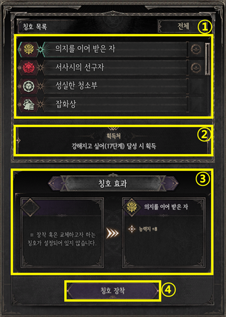 ① 전체 칭호와 현재 보유 중인 칭호를 확인할 수 있습니다.