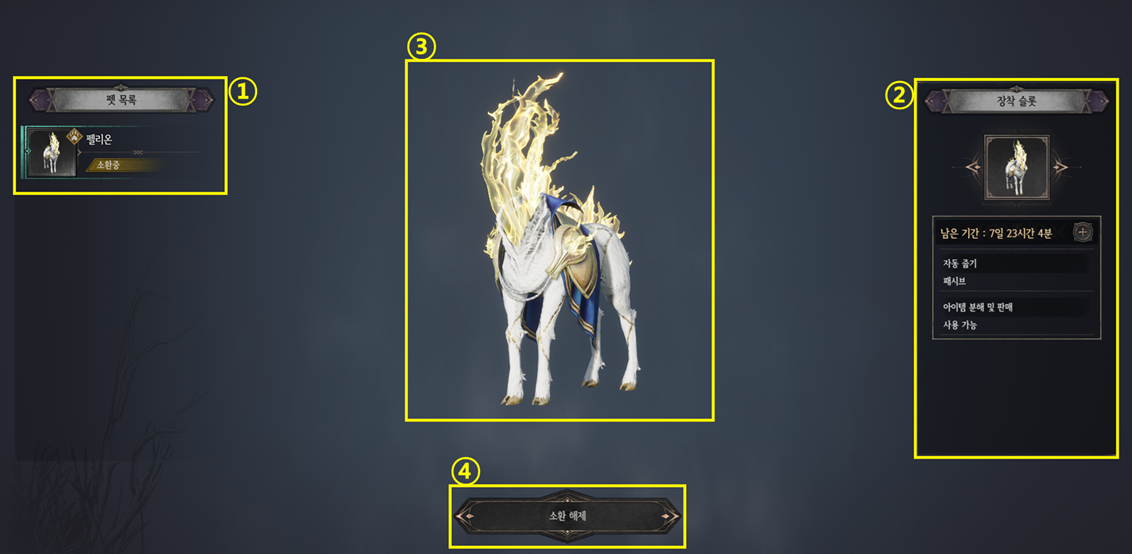 ④ 펫을 소환하거나 해제할 수 있습니다.