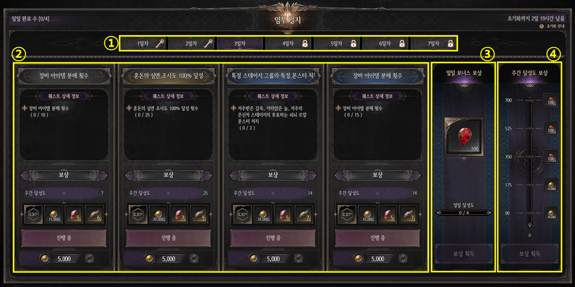 ② 각 일일 퀘스트별 설명, 보상, 주간 달성도 등을 확인할 수 있습니다.